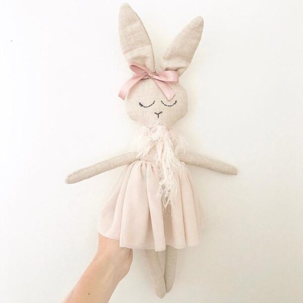 Sally Bun comes dressed in the softest tulle skirt, hand-knitted shawl, and satin bow.