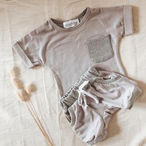 This adorable set comes in a neutral gravel colour and includes a short sleeve t-shirt, along with matching shorts. The sets are made from a soft cotton and elastane blend. Keep your baba cool and stylish at the same time. Perfect for summer weather.