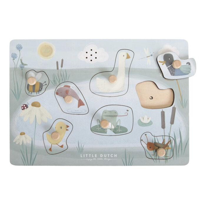 Meet Little Goose and his friends, recognise their shapes and learn their individual sounds with this lovely sound puzzle. Put the animal correctly into the puzzle board and listen to its splash, croak or buzz.
