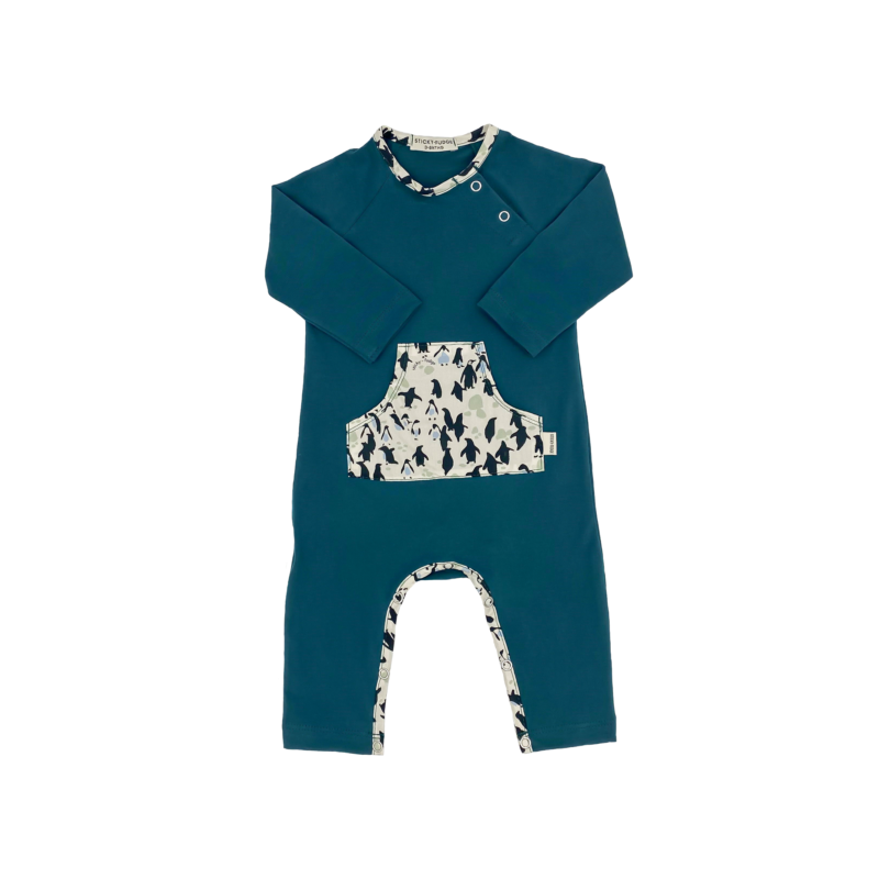 Long Sleeve Babygrow with Kangaroo Pocket- Forest Green & Penguin