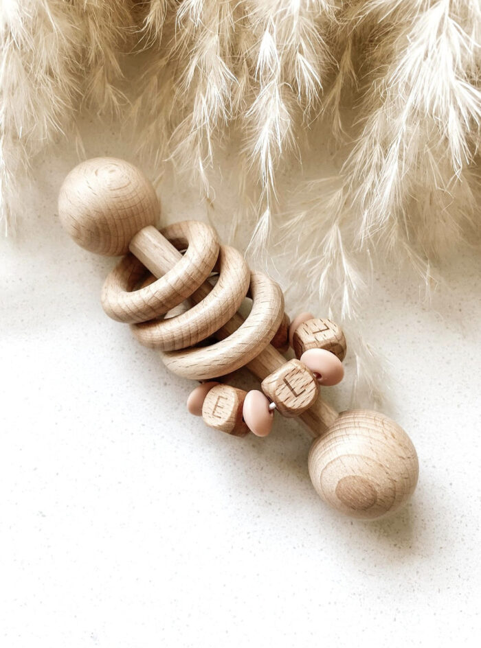 Beautiful wooden rattle with option to personalize. A lovey gift for a baby, and precious keepsake.