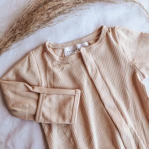 The Ribbed Sleepsuit is gender neutral and comes with a zip closure, fold over cuffs on the sleeves, and enclosed feet. The sleepsuit is available in two colours – Honey & Ivory. Perfect for winter or cool summer days.