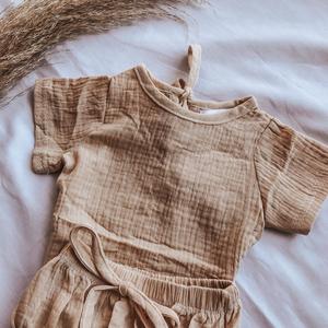Our Summer Set is gender neutral and comes in two colours – Honey and White. The sets are made from a lightweight muslin cotton to keep your baby cool in warm weather.