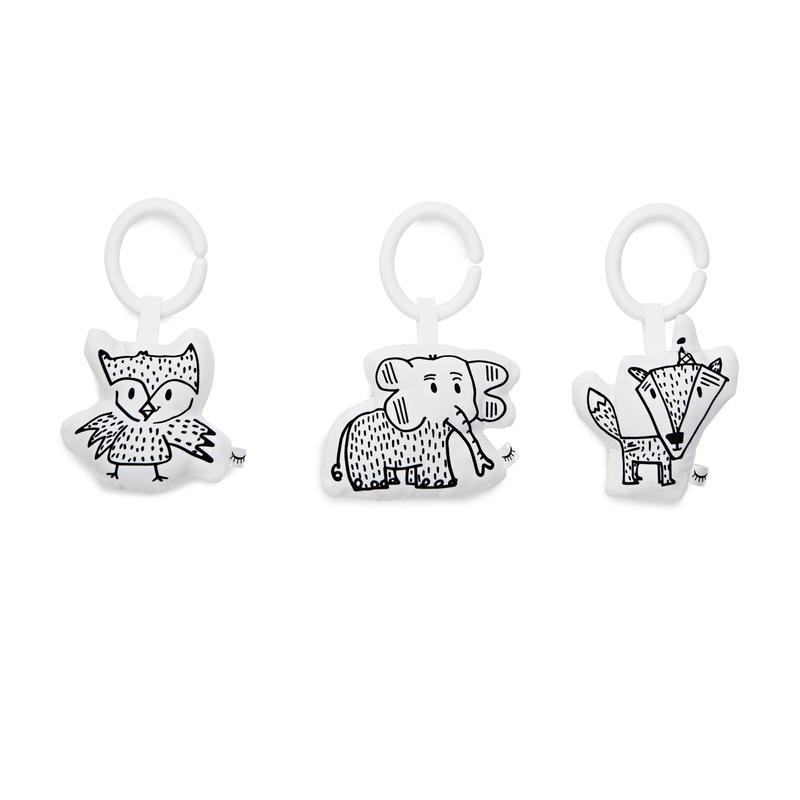 The black and white toy designs help stimulate baby’s vision